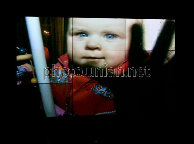 Маленький ребенок на экране во время встречи-ланча с представителями власти и большого бизнеса "Согрей любовью ребенка" в Киеве, во вторник, 11 декабря 2007 г. Цель акции – поиск путей сотрудничества в решении проблем многодетных семей. Президент Украины Виктор Ющенко призвал украинский бизнес и власть к участию в благотворительности в поддержку многодетных семей. Виктор Ющенко сообщил, что намеревается создать Национальный совет при Президенте Украины по вопросам благотворительности. В Украине насчитывается приблизительно 13,5 млн. семей, из них 396, 2 тыс. – многодетные. Фото Михаила Маркива / POOL / УНИАН