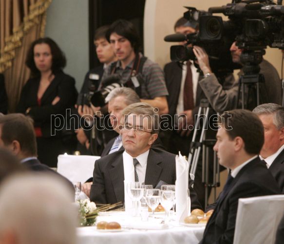 Президент Украины Виктор Ющенко, в центре, во время встречи-ланча представителей власти и большого бизнеса ”Согрей любовью ребенка” в Киеве, во вторник, 11 декабря 2007 г. Цель акции – поиск путей сотрудничества в решении проблем многодетных семей. Президент Украины Виктор Ющенко призвал украинский бизнес и власть к участию в благотворительности в поддержку многодетных семей. Виктор Ющенко сообщил, что намеревается создать Национальный совет при Президенте Украины по вопросам благотворительности. В Украине насчитывается приблизительно 13,5 млн. семей, из них 396, 2 тыс. – многодетные. Фото Михаила Маркива / POOL / УНИАН