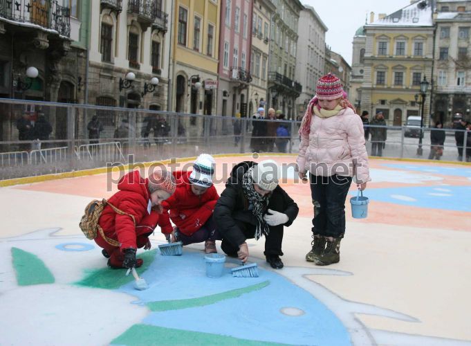 Дети разукрашивают центральный городской каток на площади Рынок возле Ратуши во Львове в среду, 19 декабря 2007 г. Перед праздничным официальным открытием дети из львовских школ разрисовали лед красками: огромная картина, по словам организаторов, претендует, по крайней мере, на занесение в Книгу рекордов Украины. Во Львове среди детей был объявлен конкурс – кто лучше нарисует героев рождественских праздников Николая и ангелов, которых решили в увеличенном виде перенести на лед львовского катка. Компетентное жюри, возглавляемое львовским художником Олесем Дзиндрой, среди огромного количества рисунков-претендентов выбрало роботы Аленки Ильницкой, Анны Яцкив и Софийки Плахотник. Во время открытия катка мер города Андрей Садовый наградил юных львовянок новогодними подарками – большими елочными шарами с оригинальными рисунками, изготовленными мастерами львовской стекло-зеркальной фабрики. Фото УНИАН