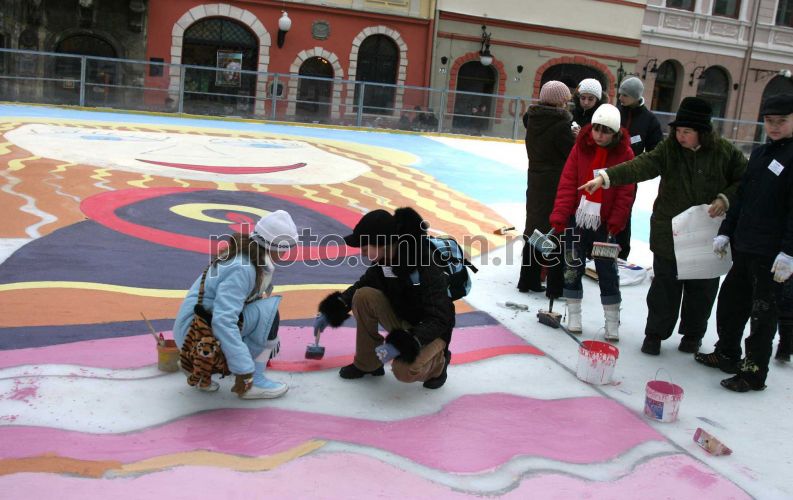 Дети разукрашивают центральный городской каток на площади Рынок возле Ратуши во Львове в среду, 19 декабря 2007 г. Перед праздничным официальным открытием дети из львовских школ разрисовали лед красками: огромная картина, по словам организаторов, претендует, по крайней мере, на занесение в Книгу рекордов Украины. Во Львове среди детей был объявлен конкурс – кто лучше нарисует героев рождественских праздников Николая и ангелов, которых решили в увеличенном виде перенести на лед львовского катка. Компетентное жюри, возглавляемое львовским художником Олесем Дзиндрой, среди огромного количества рисунков-претендентов выбрало роботы Аленки Ильницкой, Анны Яцкив и Софийки Плахотник. Во время открытия катка мер города Андрей Садовый наградил юных львовянок новогодними подарками – большими елочными шарами с оригинальными рисунками, изготовленными мастерами львовской стекло-зеркальной фабрики. Фото УНИАН