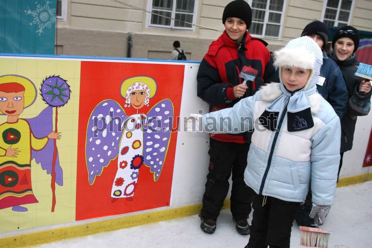 Победительница конкурса показывает свой рисунок на центральном городском катке на площади Рынок возле Ратуши во Львове в среду, 19 декабря 2007 г. Перед праздничным официальным открытием дети из львовских школ разрисовали лед красками: огромная картина, по словам организаторов, претендует, по крайней мере, на занесение в Книгу рекордов Украины. Во Львове среди детей был объявлен конкурс – кто лучше нарисует героев рождественских праздников Николая и ангелов, которых решили в увеличенном виде перенести на лед львовского катка. Компетентное жюри, возглавляемое львовским художником Олесем Дзиндрой, среди огромного количества рисунков-претендентов выбрало роботы Аленки Ильницкой, Анны Яцкив и Софийки Плахотник. Во время открытия катка мер города Андрей Садовый наградил юных львовянок новогодними подарками – большими елочными шарами с оригинальными рисунками, изготовленными мастерами львовской стекло-зеркальной фабрики. Фото УНИАН