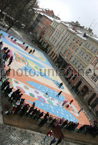 Центральный городской каток на площади Рынок возле Ратуши во Львове в среду, 19 декабря 2007 г. Перед праздничным официальным открытием дети из львовских школ разрисовали лед красками: огромная картина, по словам организаторов, претендует, по крайней мере, на занесение в Книгу рекордов Украины. Во Львове среди детей был объявлен конкурс – кто лучше нарисует героев рождественских праздников Николая и ангелов, которых решили в увеличенном виде перенести на лед львовского катка. Компетентное жюри, возглавляемое львовским художником Олесем Дзиндрой, среди огромного количества рисунков-претендентов выбрало роботы Аленки Ильницкой, Анны Яцкив и Софийки Плахотник. Во время открытия катка мер города Андрей Садовый наградил юных львовянок новогодними подарками – большими елочными шарами с оригинальными рисунками, изготовленными мастерами львовской стекло-зеркальной фабрики. Фото УНИАН