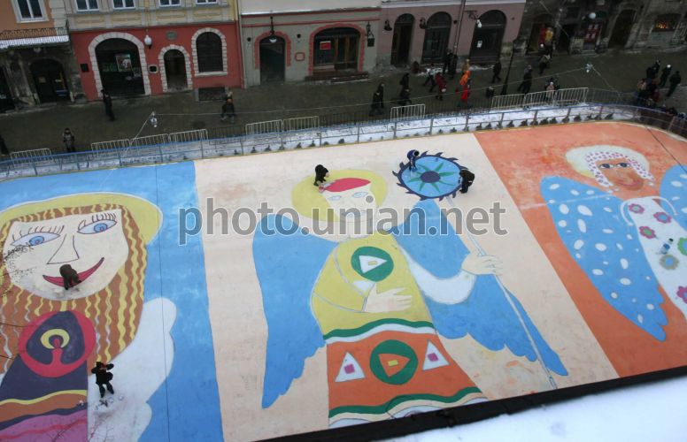 Детские рисунки на центральном городском катке на площади Рынок возле Ратуши во Львове в среду, 19 декабря 2007 г. Перед праздничным официальным открытием дети из львовских школ разрисовали лед красками: огромная картина, по словам организаторов, претендует, по крайней мере, на занесение в Книгу рекордов Украины. Во Львове среди детей был объявлен конкурс – кто лучше нарисует героев рождественских праздников Николая и ангелов, которых решили в увеличенном виде перенести на лед львовского катка. Компетентное жюри, возглавляемое львовским художником Олесем Дзиндрой, среди огромного количества рисунков-претендентов выбрало роботы Аленки Ильницкой, Анны Яцкив и Софийки Плахотник. Во время открытия катка мер города Андрей Садовый наградил юных львовянок новогодними подарками – большими елочными шарами с оригинальными рисунками, изготовленными мастерами львовской стекло-зеркальной фабрики. Фото УНИАН