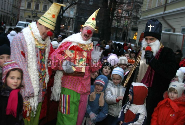 Артисты выступают перед детьми на открытии центрального городского катка на площади Рынок возле Ратуши во Львове в среду, 19 декабря 2007 г. Перед праздничным официальным открытием дети из львовских школ разрисовали лед красками: огромная картина, по словам организаторов, претендует, по крайней мере, на занесение в Книгу рекордов Украины. Во Львове среди детей был объявлен конкурс – кто лучше нарисует героев рождественских праздников Николая и ангелов, которых решили в увеличенном виде перенести на лед львовского катка. Компетентное жюри, возглавляемое львовским художником Олесем Дзиндрой, среди огромного количества рисунков-претендентов выбрало роботы Аленки Ильницкой, Анны Яцкив и Софийки Плахотник. Во время открытия катка мер города Андрей Садовый наградил юных львовянок новогодними подарками – большими елочными шарами с оригинальными рисунками, изготовленными мастерами львовской стекло-зеркальной фабрики. Фото УНИАН