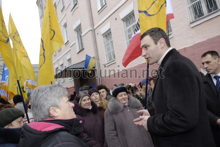 Депутат Киевсовета Виталий Кличко беседует с активистами Блока Кличко во время пикета здания Шевченковского суда , в Киеве в пятницу, 21 декабря 2007 г. В Шевченковском районном суде г. Киева было запланировано предварительное слушание дела «Виталий Кличко против городской власти», которое было перенесено. Виталий Кличко требует отменить все решения сессии Киеврады от 1 октября 2007 года, во время которой было роздано свыше 2 000 гектаров столичных земель. Фото Павла Терехова / УНИАН