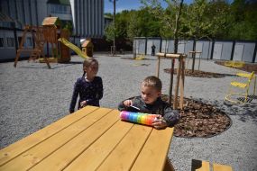 Подростки играют в настольный теннис в модульном городке для переселенцев