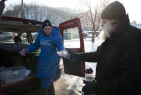 Бездомный мужчина ест картофельное пюре из пластиковой тарелки