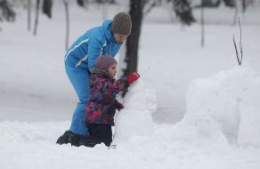 Зимние развлечения в Киеве. Дети лепят снеговика